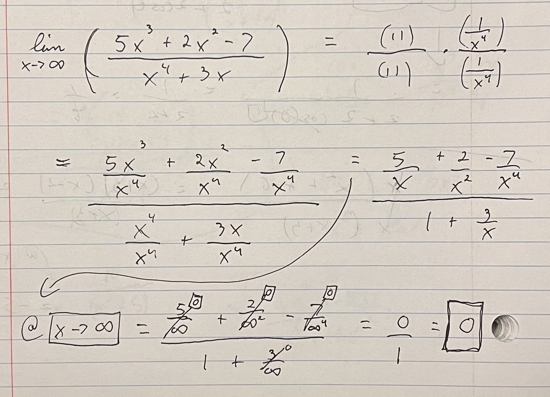 The reason why I was able to solve this question on my first attempt with the same type of algebra KA used is because I had seen a question just like this last week and had the algebra fresh in my mind. I knew that I needed to multiply the numerator and the denominator by one-over the highest ordered value of x (i.e. 1/x1/4) and then substitute ∞ in for all the x’s. You can see that’s what I did to show that the limit was 0.