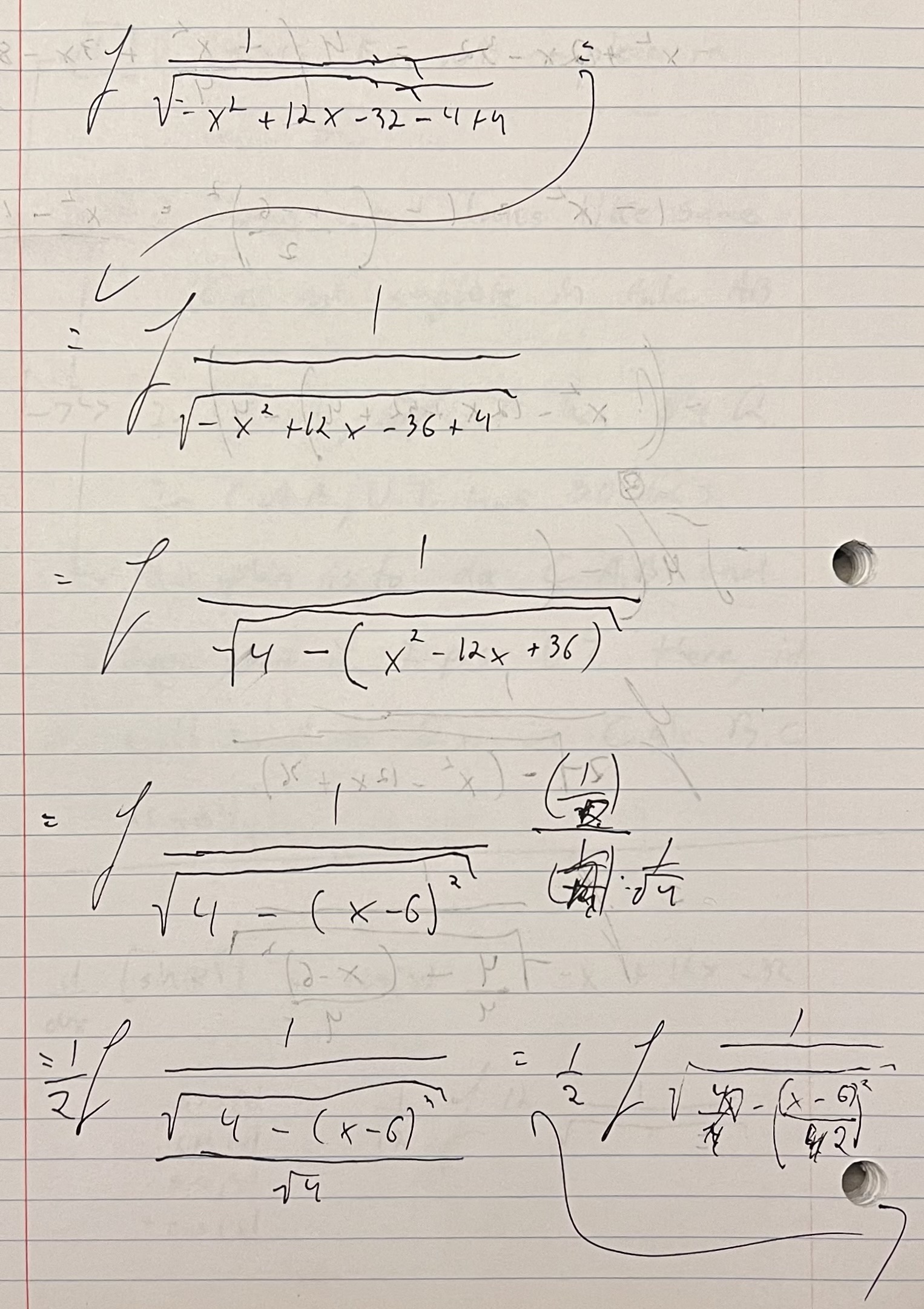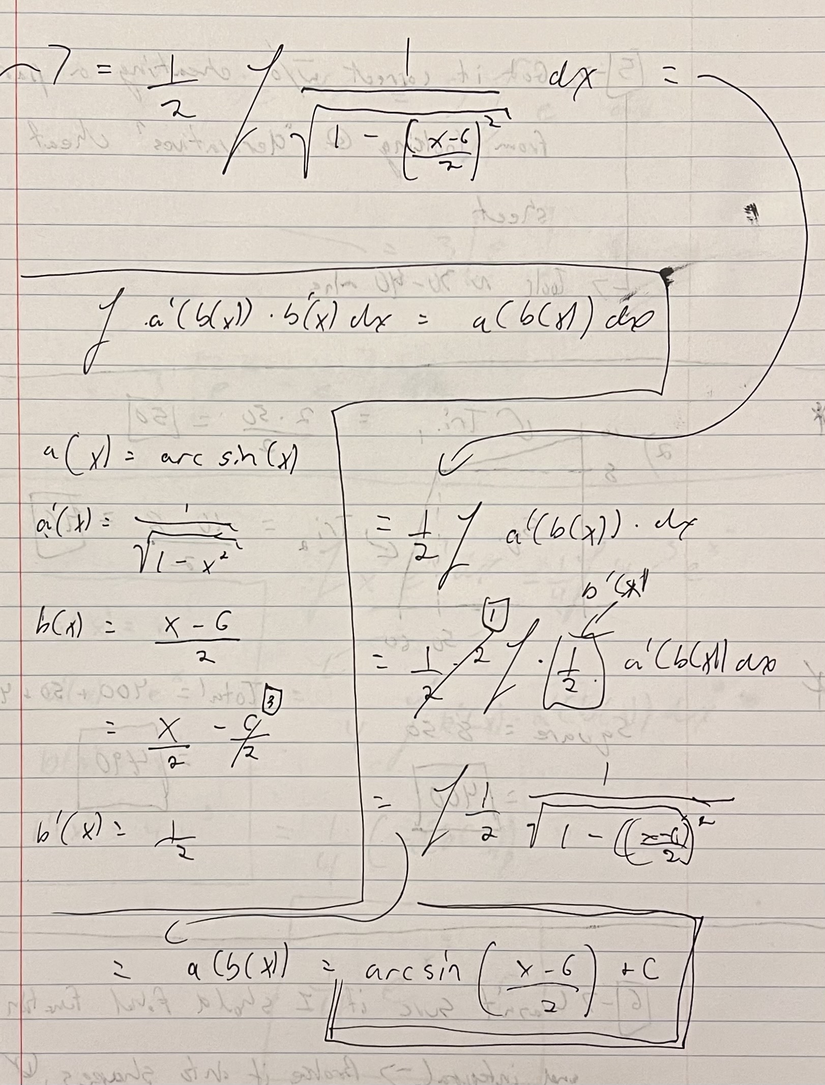 This was the first question that came up on the unit test. I was completely shocked and PUMPED that I was able to figure it out without cheating. It took me about 30–40 minutes to work through and I sort of did it backwards. I don’t think anyone would be able to understand my notes and my method of madness to solve it — they were supposed to just be rough notes that I wasn’t planning to add here but I figured I might as well. After looking at my derivatives cheat sheet (which I guess you could consider cheating) I realized that the integrand looked like the shape of the derivative of arcsin(x), ∫1/(1 – x2)1/2). With that in mind, I used algebra to get the expression in the denominator of the integrand to look something like (1 – x2)1/2. Honestly, I can’t remember off the top of my head how I did it and don’t feel like digging into it now but regardless, I did it and that’s all that matters. 💪🏼