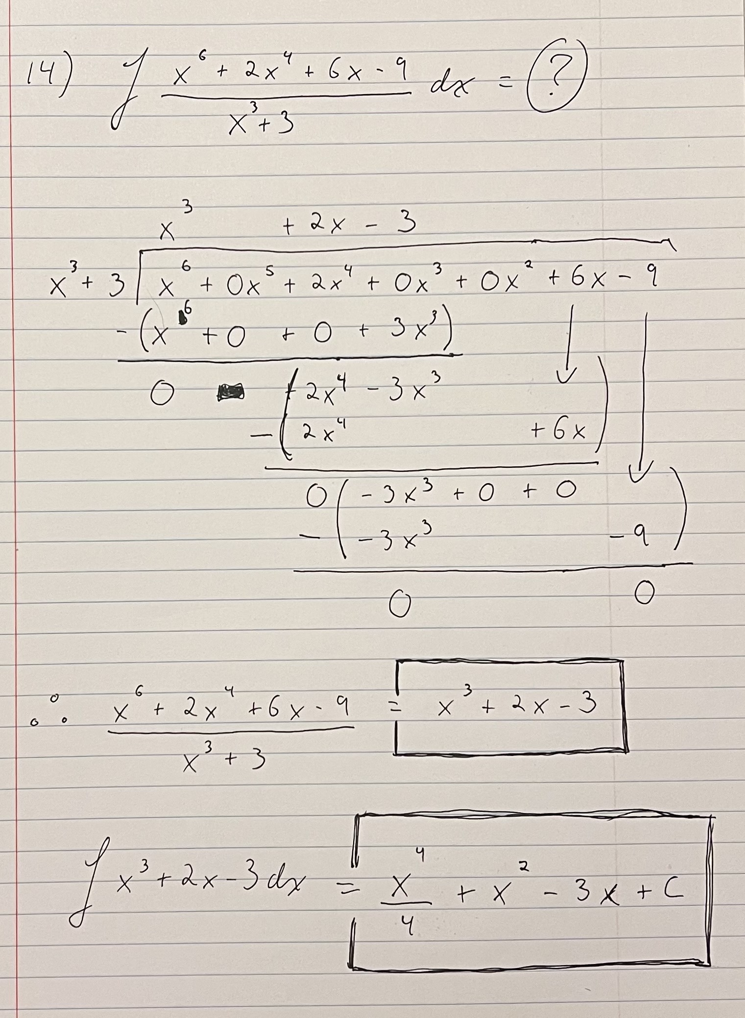 I was 14 questions into the test when I got this question wrong. 😞 I initially thought I should try to use polynomial long division to simplify the integrand (which turned out to be correct), but I couldn’t remember how to do it. I tried a few other methods to simplify it but couldn’t make any progress. I eventually threw the integral into Symbolab and they gave me the wrong answer! 😡 (Which was probably for the best considering I was cheating…) Once I saw KA’s answer, it took me about 20 minutes to review and remember how polynomial long division works. I’m not going to try to explain how it works here, but when I finally wrapped my head around it, it was a relief.