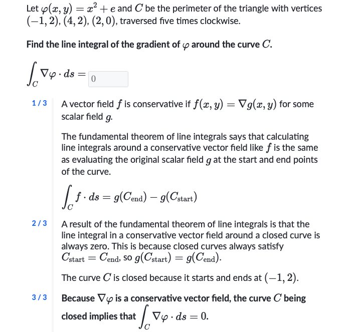 This was a confusing question. I drew out a triangle but then realized it was asking for the line integral of the gradient, i.e. the change in height around the top of the “fence” (as I like to think of it). Given that it was a triangle, it seemed that the total change in height from start to finish would be 0 since you would just end up at the same spot. So, I answered with 0 and got it correct. (You can see that they really tried to trick me by saying, “five times clockwise”. 😠)