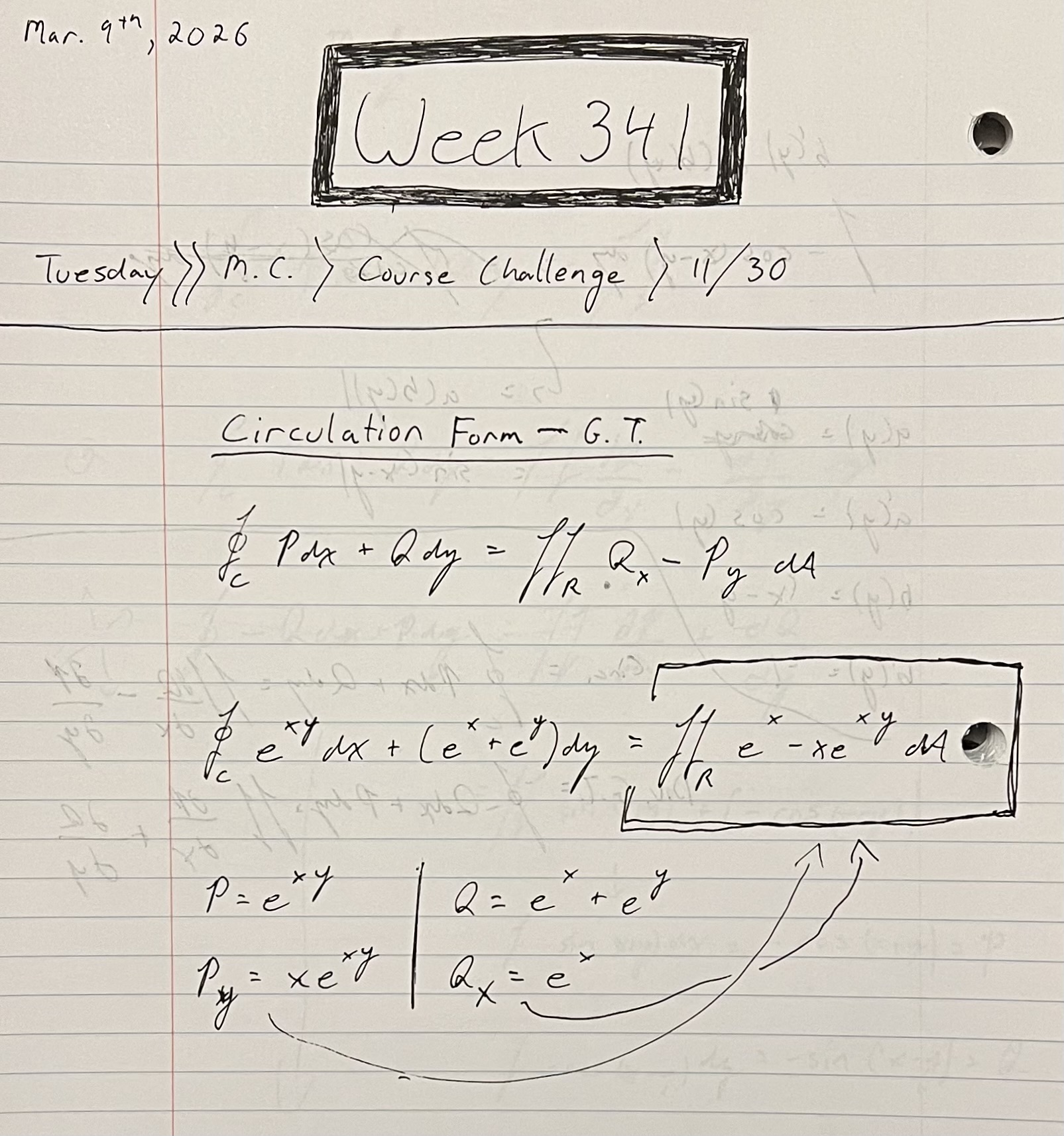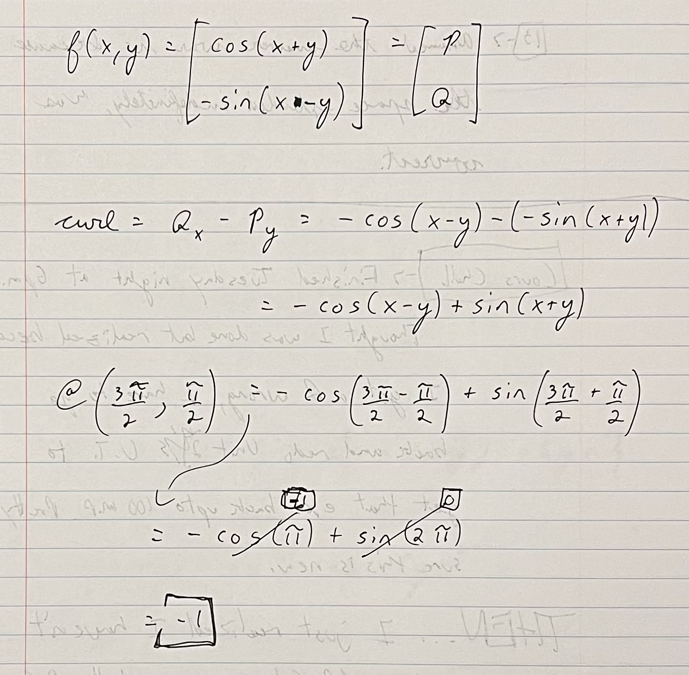 This was the 11th question on the test which I had read at the end of last week but didn’t attempt. I knew when I saw it on Sunday that I didn’t remember Green’s Theorem so I watched a few videos on G.T. on Monday and Tuesday morning before coming back to this question. I sort of remember what G.T. is (the metaphor I use is that it’s like the curl around the edge of a whirl being equal to the sum of all the little curls within the whirl pool), but I couldn’t remember how to solve G.T. or why it works. I knew the formula was ∫Pdx + Qdy = ∫∫Qx + Py dA so I integrated both Q and P with respect to x and y but Py = sin(x – y) which wasn’t one of the given solutions. So, I guessed with answer c) because it had the same Qx I got in my solution and ended up choosing the correct answer. It turned out I was using the wrong form of Green’s Theorem. I was using the “curl” version of G.T. when I should have been using the “divergence” form of G.T., a.k.a. the “Normal Form” as the question stated. I feel pretty guilty that I didn’t know what I was doing not his question but still got it correct. I should probably go back and rewatch some vids on G.T. so that I actually understand it a bit better… 😒