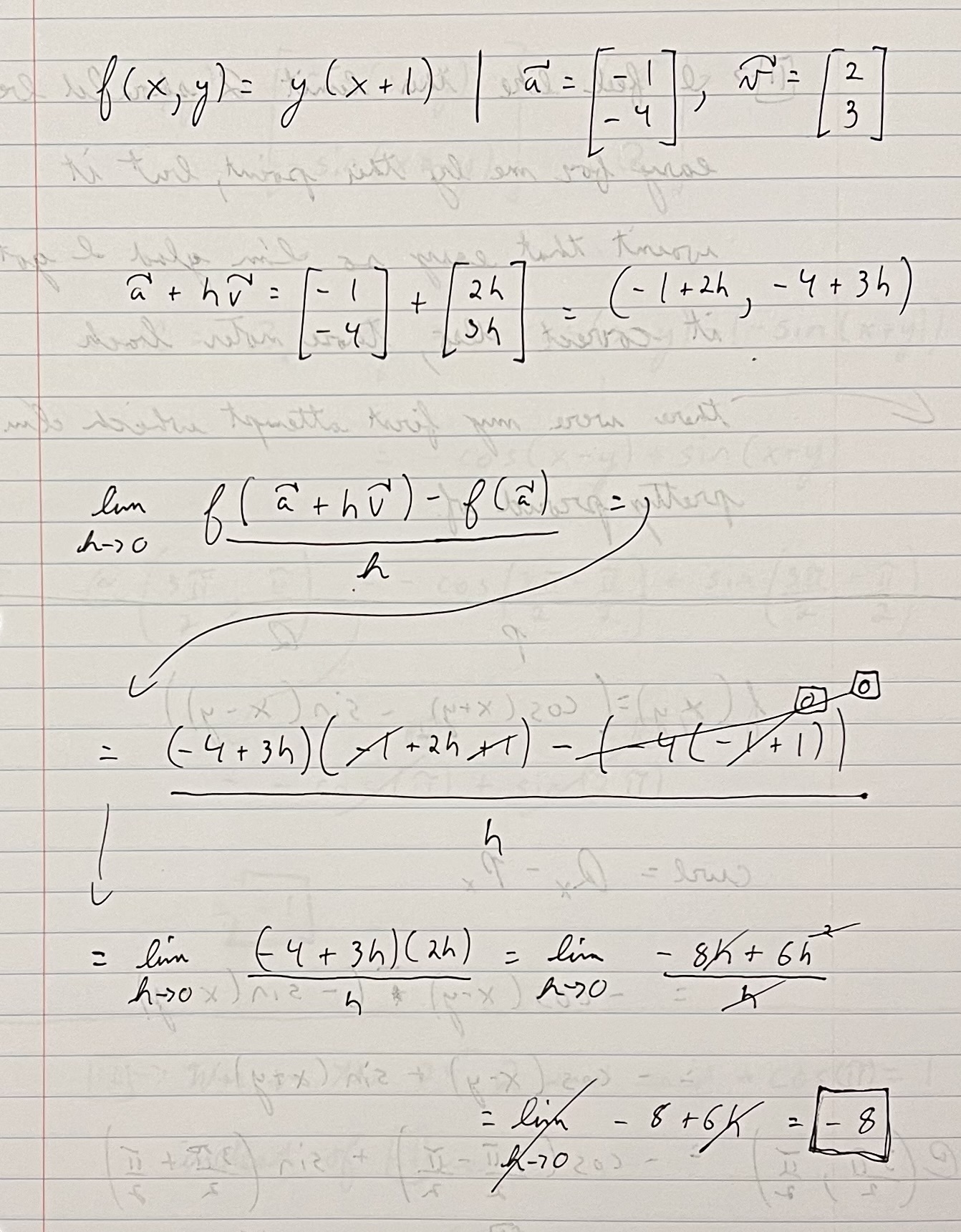 I couldn’t remember the formula for this question but just reasoned my way to the correct solution. I figured that h’(t) = f’(g(t))⋅g’(t) which looked familiar and correct in my mind. Based on the answer box, I knew I needed a scaler value which is why I assumed I needed the dot product of ∇f(g(t))⋅g’(t). Turned out I was correct because I’m a complete genius/gangsta.